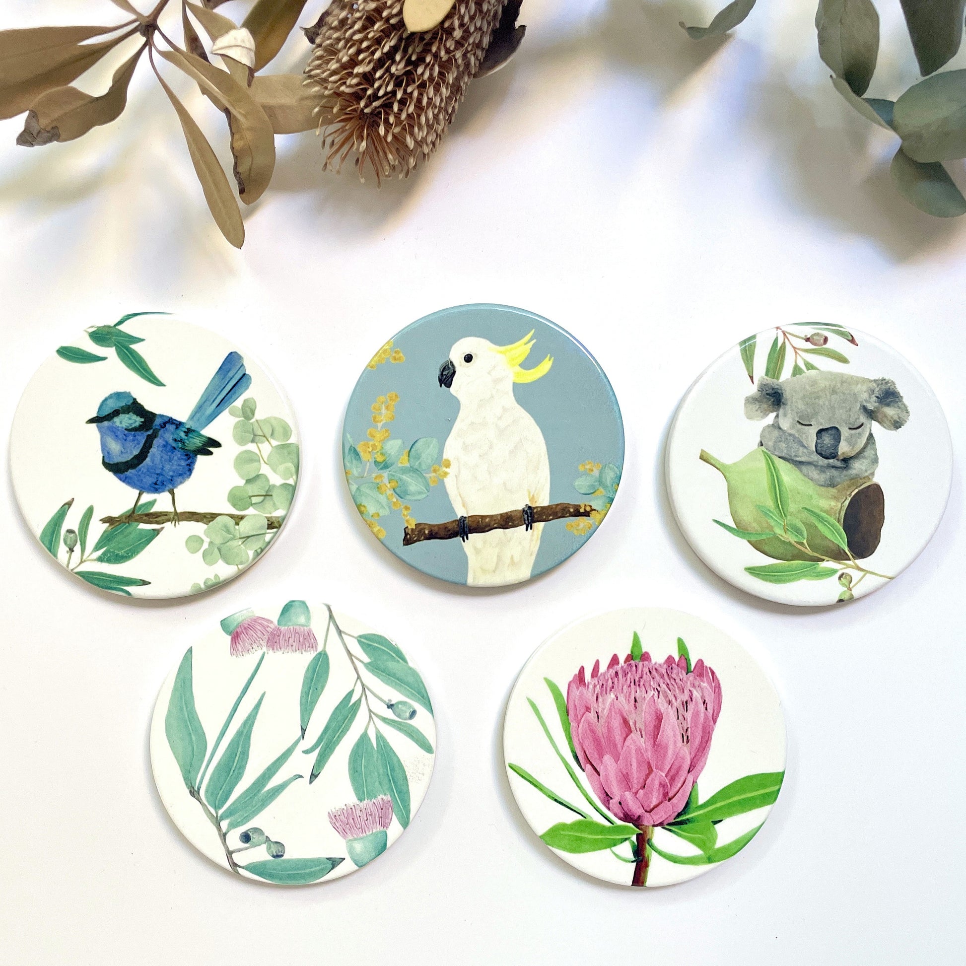 Immerse yourself in the vibrant essence of Australia with stunning ceramic coasters featuring Teresa's original watercolour designs. Each coaster showcases Australian unique vegetation and wildlife.